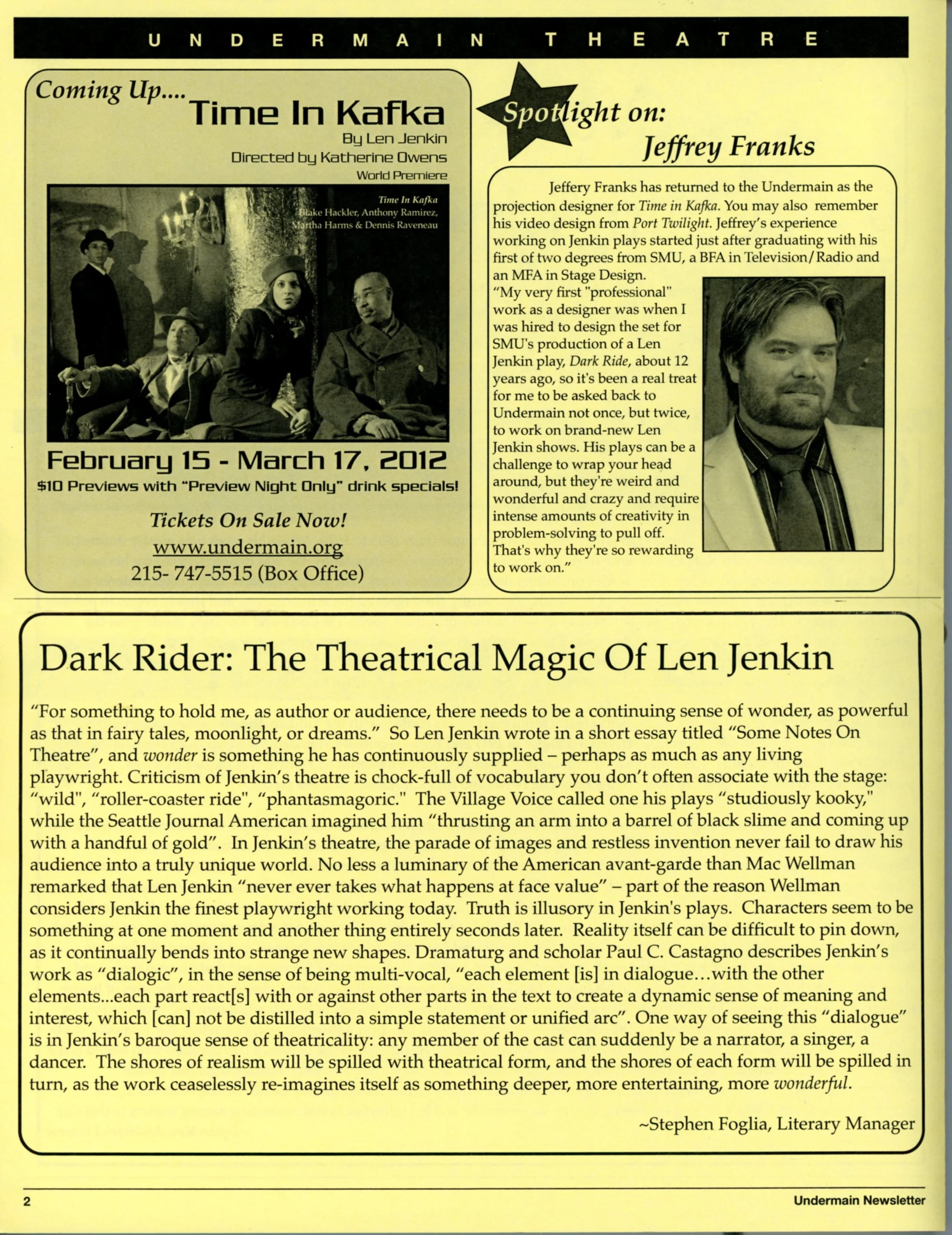 The latest play by Obie award-winning playwright Len Jenkin, author of Margo Veil and Port Twilight. In search of the elusive Franz Kafka, a professor loses himself in time and in Prague. A delightful new play by a master American playwright.
