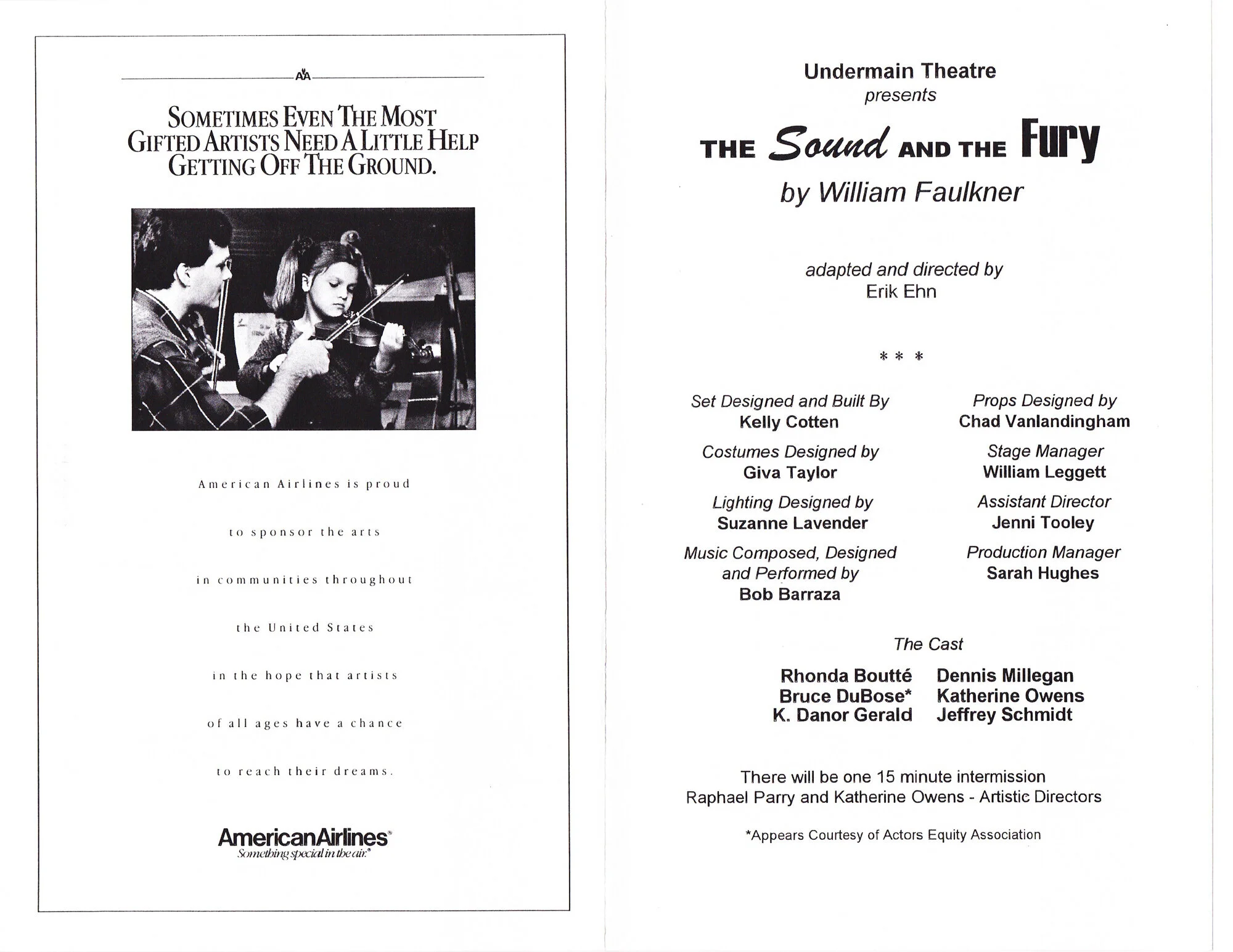 Innocence forfeited for sexual promiscuity. Aristocracy forfeited for desperate capital greed. Honor substituted for orthodoxy. These are only a few of the themes of the Undermain Theatre’s presentation of William Faulkner’s The Sound and the Fury, adapted and directed by playwright Erik Ehn. Many consider The Sound and the Fury, which portrays the decline of the once-aristocratic Compson family, to be Faulkner’s finest work.